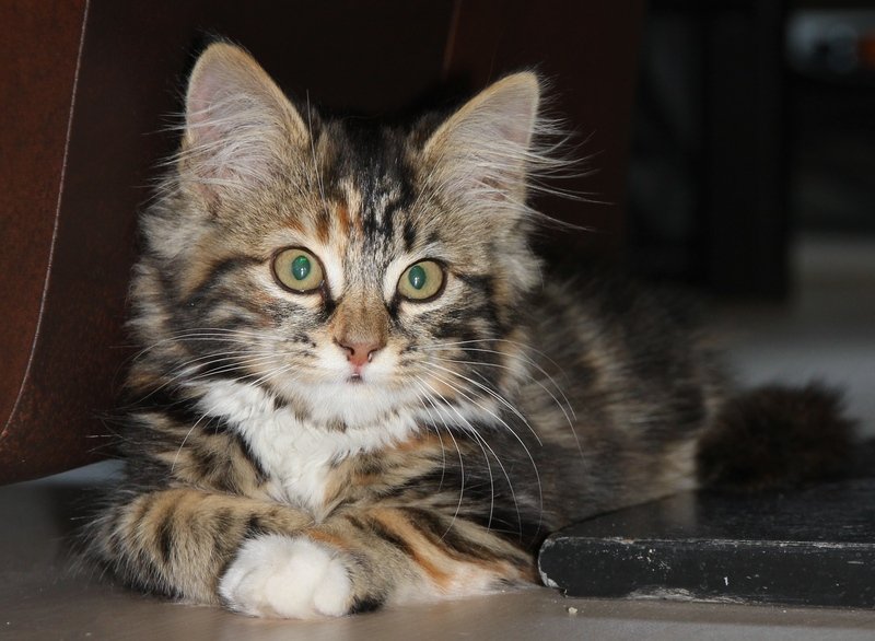 Ung stripete hunkatt, ganske liten, med flott fargespill i pelsen, noen røde striper