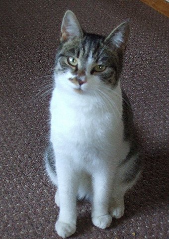 Lita hunnkatt, ca 1-2 år+?. Korthåret, hvit m/grå og svarte striper over ryggen. Brunlig flekk v/nesen og under haken. Svarte flekker bak på begge bakben og bak på høyre forlabb. Kjærlig, leken, tillitsfull.