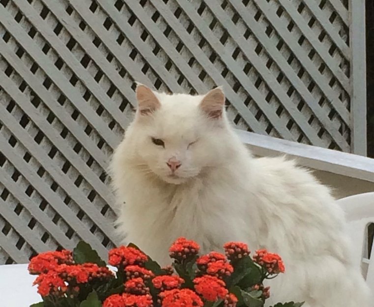 Hvit langhåret, mangler et øye, ca 6kg men ikke tjukk, øremerket, sosial