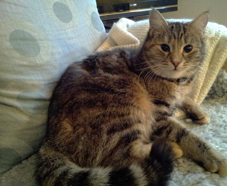 Nå er min dyrebare Hassel kommet til rette igjen. Hun ble funnet av en nabo, innestengt i kapellet på gravplassen. Jeg var selv på jobb,så naboen tok ansvar og kontaktet Akasias vaktmester. Flere naboer og to nevøer stod klar da den gode vaktmester kom. Ble kanskje litt mye for en skremt katt, så hun gjemte seg slik at ingen fant henne. Naboer viste råd og la inn vann og mat til jeg kom hjem fra jobb. Den snille Akasia vaktmesteren kom for andre gang på en lørdag, og når jeg kalte på henne kom hun ut av sitt gjemmested og løp glad hjem. Nå skjelver hun ikke lengre( hun var virkelig skremt der inne) har spist,lekt og sovet, og kattemor er lykkelig. Lykkelig over å være så heldig at hun ble funnet og er kommet hjem, og også veldig takknemlig for alle som har støttet og oppmuntret meg, og over alle i mitt nabolag som har lett og som faktisk fant henne.