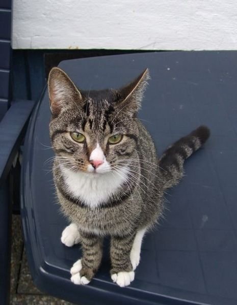 Denne katten har holdt til i hagen vår på Gyldenpris i flere dager. Den mjauer og vil ha kos og oppmerksomhet. Begynner å bli tynn, sluker maten når vi fôrer den.
