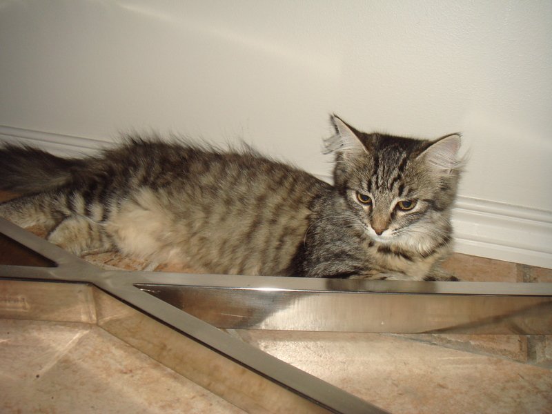 liten søt pusejente, tigerstripet, med beige mage,sorte poter og stor kraftig hale som er mørk brun på oversiden