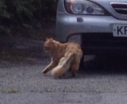Det er en rødlig pus som ser tynn og pjusete ut som tusler rundt i nabolaget. Den er veldig sky så jeg får ikke fanget den. Mjauer/skriker en del.