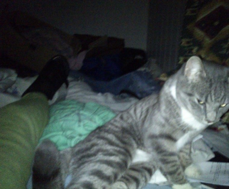 han er 3år gammel,kasterert,grå og hvit. m ett hint av brunt på hver side av ansikt,og innsiden av hver frm pote. hvite sokker.og hvit mage og bryst.