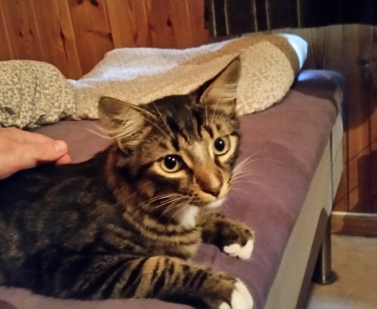 Fant en tynn og svært sulten, men tillitsfull hannkattunge. Han mjauet og skalv så vi tok han med hjem for å gi han mat og varme. Fant roen veldig fort så det er ingen villkatt.