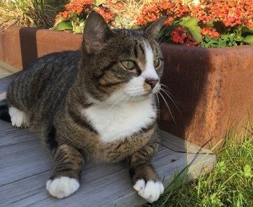 Stor grå/brun hannkatt, hvitt parti på bryst og hvite poter. Brun flekk rett under nesen. Han er også ID merket og øremerket med en M i øret.