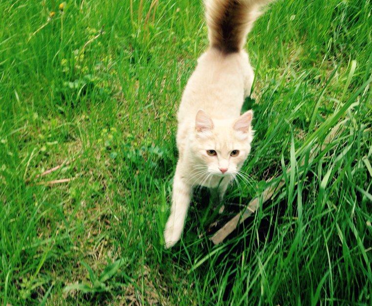 En liten og søt katt(unge) oppholder seg rundt husene våre. Den virker sulten og er skvetten.