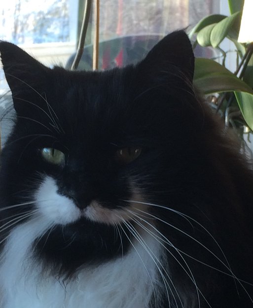 Hvit i fjes, i bringen og under magen. Ellers svart