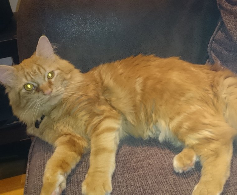 Rød langhåret med rødt halsbånd. Kan være litt redd ute blant mennesker.