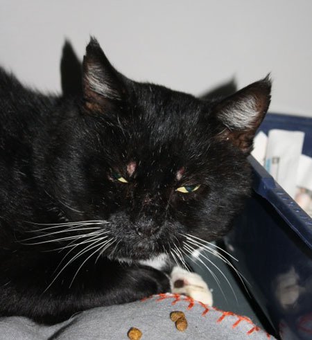 Snill, men forsiktig kar, korthåret sort og hvit pels. Har flere sår etter slossing med andre katter, sliten, men glad for å bli tatt vare på.