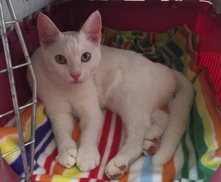 Han er helt hvit, rosa ører og grønn/gule øyne. Hvis man får sett veldig nært, har han ett par svarte hår i panna, men de er ikke lett å se.