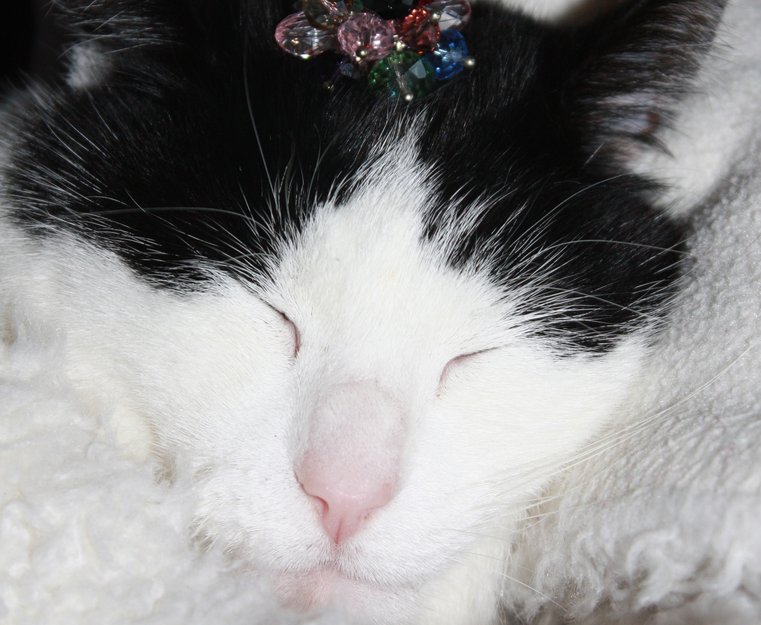 Lucie er sort og hvit, sort hale med hvit haletupp.