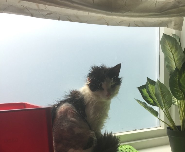 Halve Katten (bakparten) er barbert. Han har også en god del sår grunnet store floker, midd og flått. Skal ikke få no mer av det på en stund da han fikk dråper mot dette.