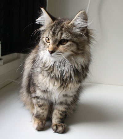 Snill og koselig pusi på ca 3 mnd, altfor liten til å gå ute alene. Langhåret med tuster i ørene, ser ut som en skogskatt. Flerfarget og tigerstripet pels. Rødt og brunt på potene.
