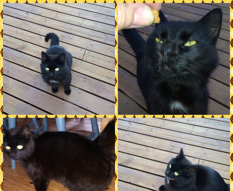 Sort kort pels, litt lite pels på ene låret, kan være etter sår eller slåsskamp. Liten hvit flekk på brystet. Virker som en ung katt. Tillitsfull. Kommer og går her hos oss. Kan være den bare streifer da den ikke er kastrert, men vi vil gjerne prøve å se om noen savner han da han helt klart har/ har hatt et hjem.