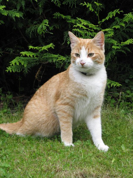 Ganske stor pus på ca. 5 kg, snill, rødstripete på kroppen hvit på buken. Han har et halsbånd på hvor det står telefonnr.