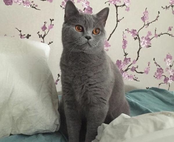 Hun har grå fyldig pels og orange øyne. Svart nese og grå værhår. Er antydning til litt lysere pels rundt nese og munn. Venstre øre bakfra har en liten klump på seg, den synes ikke, men kjennes.