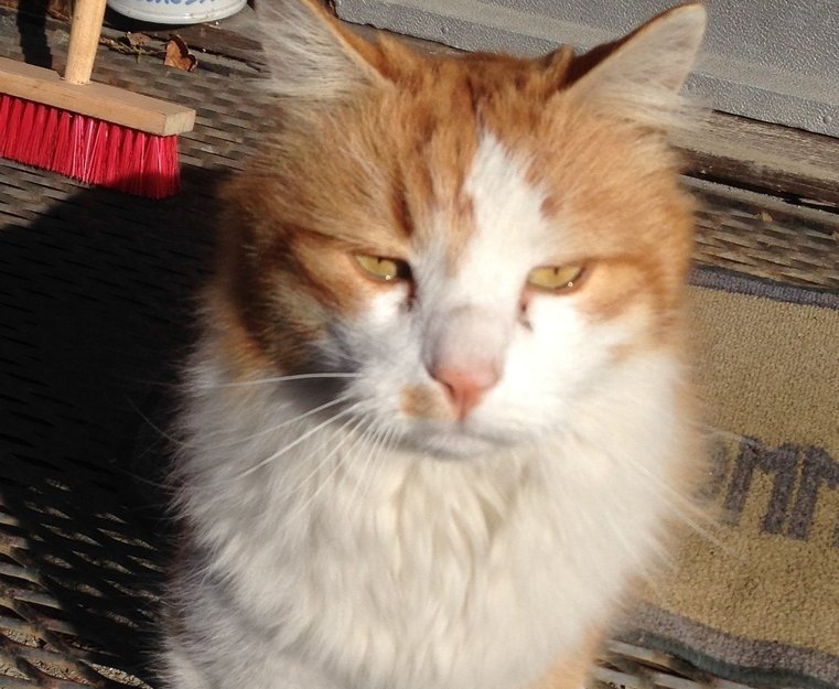 Denne vakre katten er observert i nabolaget en tid. Selv har jeg sett den til og fra siden februar 2015, mens naboer mener den har vært i området lenge før det. Vi tror den er hjemløs. Den er veldig sulten og tynn, og bærer preg av ikke å få pelsstell. Den er veldig kjælen og vil gjerne kose med alle den ser. Den er også ivrig på å komme inn når dører står åpne. "Stjeler" til seg kattemat der den kommer inn og mat står fremme. Det er en ganske stor katt, veldig snill og tillitsfull.