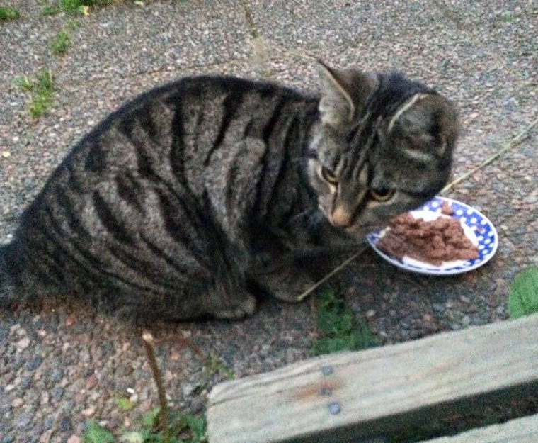Har en katt som kommer omtrent hver dag til meg. Veldig kosete og glad i mat. Har bare matet for å få tak i den. Eller så går den ute.