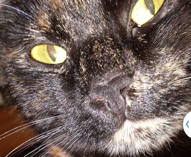 Hun er spraglete svart og gul, men fra lang avstand ser hun helt sort ut. Mellomstor med fin, blank pels. Poo er livredd andre enn meg og samboeren, så blir veldig vanskelig å få tak ikke hun dersom hun blir sett. Hvis man skal rope navnet hennes hører hun kun etter om man roper det med høy og lys tone.