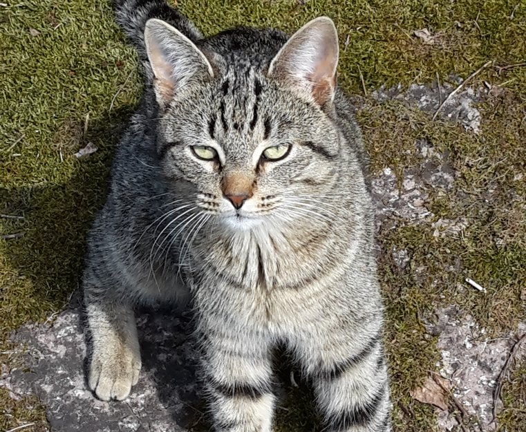 Godt voksen hannkatt, dessverre ikke ID-merket og kastrert. Grå strippet med litt lysere mage. Ingen hvite tegninger på beina!