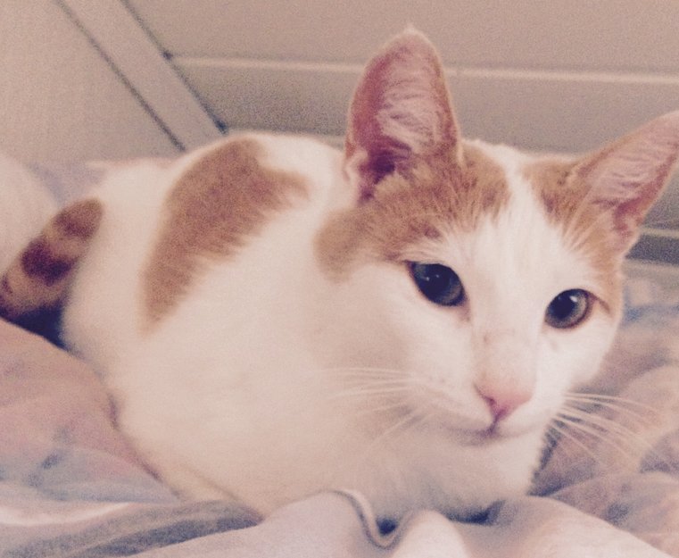 Hvitt han katt med oransje flekker og strippete hale. Litt skvetten. 3 år gammel, kastrert og med chip