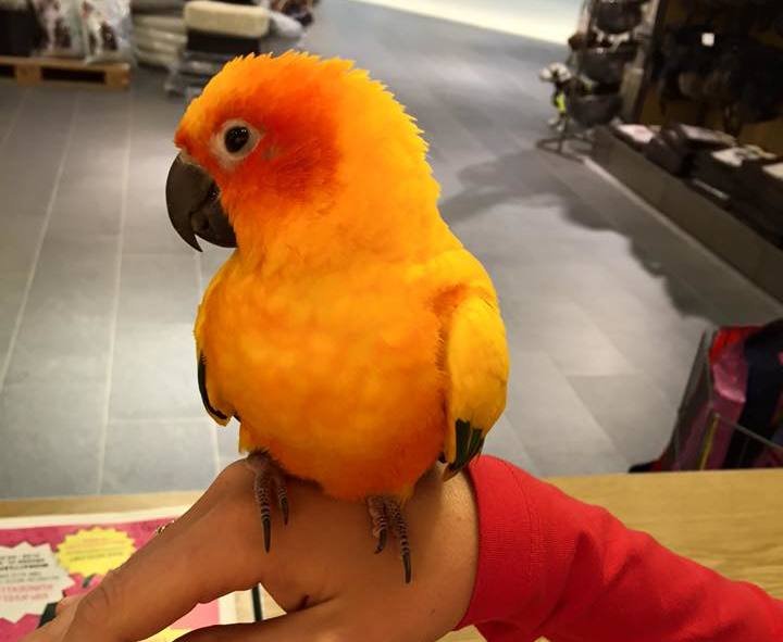 Solparakitt funnet i en garasje i Kristiansand og tatt med inn i dyrebutikken der jeg jobber. Vet dessverre ikke så mye om fuglen da de som hadde funnet den ikke snakket veldig godt norsk eller engelsk. Den har fått godt med mat og vann, og den er veldig vant til mennesker.