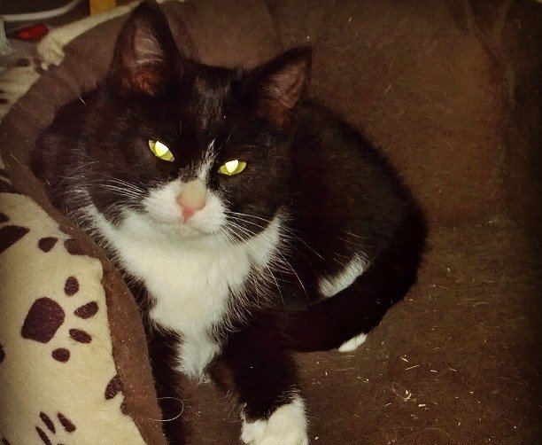 Sort hannkatt med hvite avtegn. Er ikke kastrert.
