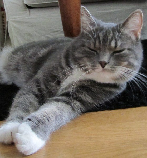 Hun er lysgrå och litt svart, tigerstripet, med kremvite poter og hals, en veldigt pen katt. Hun er ganske liten, ca 2kg, veldig snill och liker kos. Hun løper ikke ifra deg.
