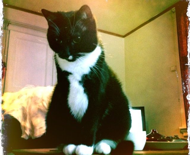 Svart og hvit (tuxedo, hvite labber og hvit flekk under nesen) hunkatt på fem år, stor (6 kg) med et mageheng. Er ikke vanligvis veldig oppsøkende mot fremmede, men kan bli kosete og oppsøkende dersom hun har vært alene lenge.