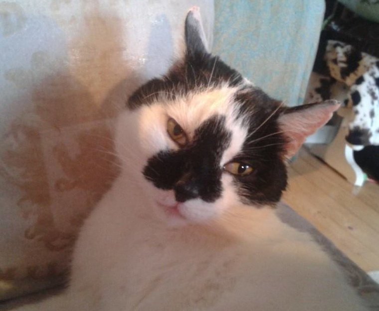 Stor hankatt - hvit med noen svarte flekker, svart hale. Spesielt ansikt med stor svart flekk over snuten og svart flekker på ørene!