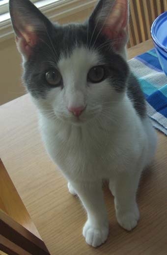 Popus har en liten 'kul' ytterst i halen. Han er en nysgjerrig og sosial krabat, og har ID-chip i nakken. Mørk grå over, hvit under, grå hale.