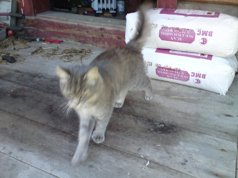 Lita huskatt-frøken. Litt tynn hale, er mest grå, men lysere sjatteringer i pelsen. Er skipskatt, dvs en klo for mye på hver labb. Kjælen og snill.