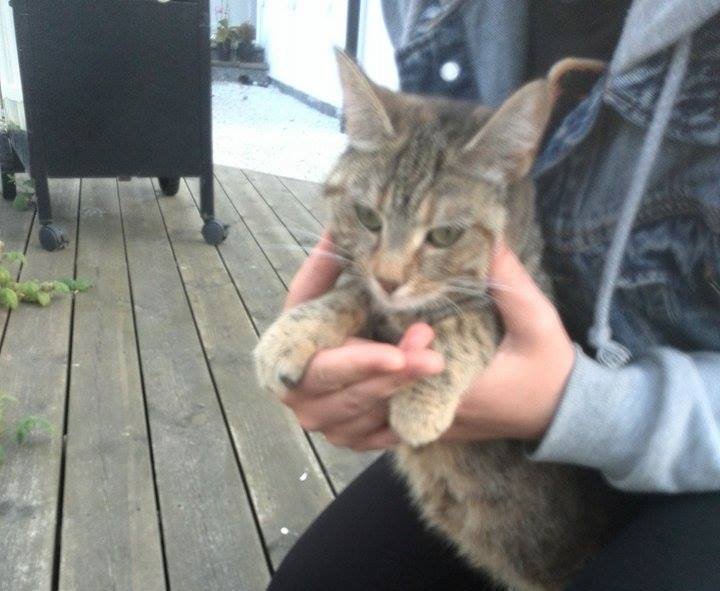Fant en ung hunkatt ved mjåtveitflaten som er underernært og drektig. Knekt hale på to steder. Hun er grå, brun og stripete.
