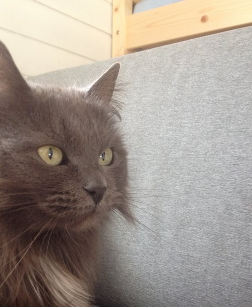 Hun er en veldi sosial og kosete katt. Hun er grå med hvit bringe.