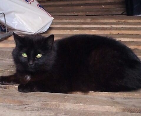 Helsort med hvitt i brystet. Katten har 3 unger. Det haster med å finne eier.
