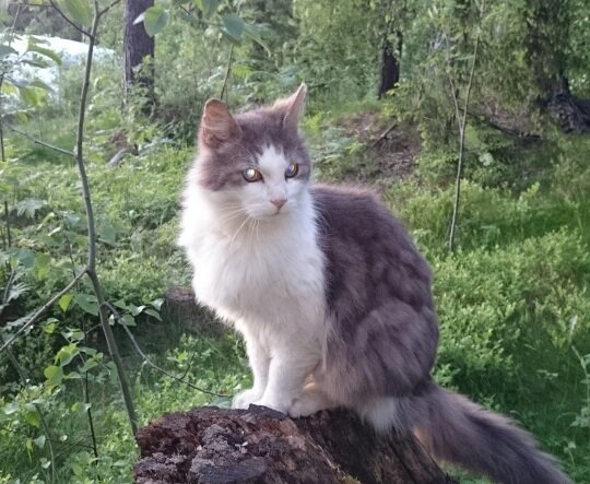 En nabo der har trodd att katten var husløs og bodde i skogen, har kontaktet dyrebeskyttelsen og de har hentet den.