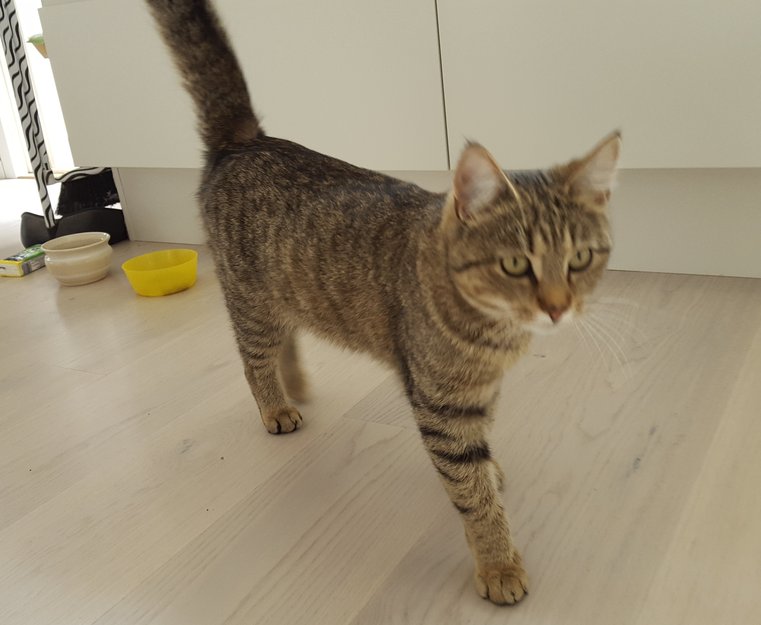 Klynket i hagen vår så vi tok den inn. Den var veldig kosete og glad i barn. Den slukte kattemat og sovnet fort etter på senga vår. I natt begynte den å Klynket igjen og så ut til å ha det vondt. Den hadde også blødd litt. I dag morges (12. juli) blødde den mer og satte seg til slutt på trappa hvor den så ut til å ha presset ut en liten blodig pose som den straks spiste. Vi tror muligens at det var abort.