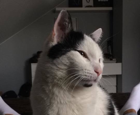 Hvit hannkatt, med svarte flekker. Tykk svart hale.