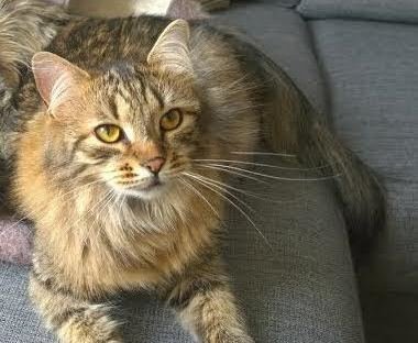 Sibirsk katt som kan minne om norsk skogskatt. Halen og pelsen er tett og lang i ulike brunfarger, mørk grå og lys gul/hvit pels under haken og under magen. Nokså gule/oransje øyne.