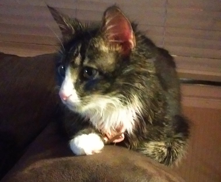 Dette er en veldig nervøs katt, sky for alle andre enn oss som bor i huset. Det var en del hannkatter som jaktet på henne en stund og jeg prøvde å holde henne inne, men hun klarte likevel å komme seg ut, og siden har vi ikke sett henne.Hun endrer adferd når hun kommer utendørs, da er det vanskelig å få henne til å komme selv til oss som hun er rimelig trygg på.