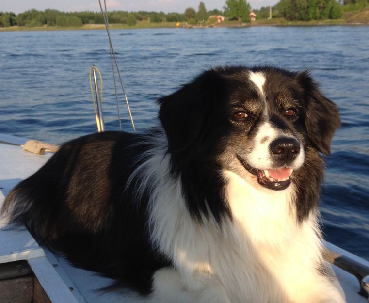 Nelly ser ut som en border collie, svart-hvit med tjukk pels og stor hale.