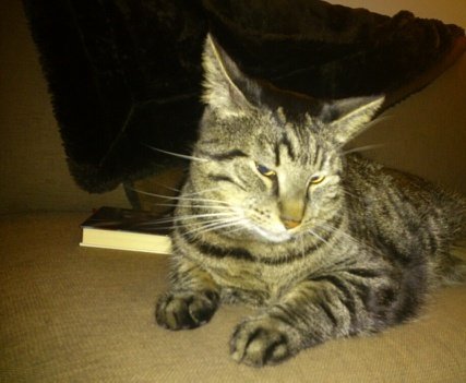 Stor. Grå og sort stripete.. Lyder ikke navnet sitt og liker ikke bli løftet opp. Men veldig snill og kosete.