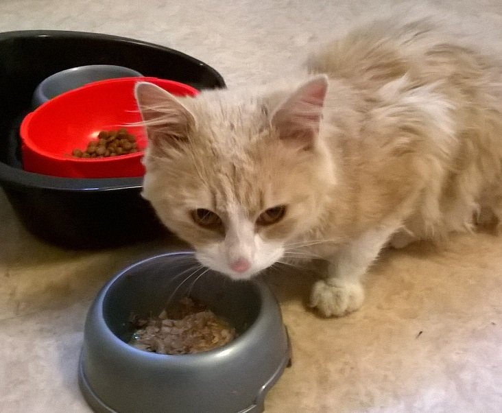 Katten kom mjauende og oppsøkende etter hjelp da vi gikk tur rundt vannet. Virket veldig tynn og litt forkommen, ustelt i pelsen og med oljeflekk i halen. Vi valgte derfor å ta den med og gi den litt mat og stell. Var svært sulten.