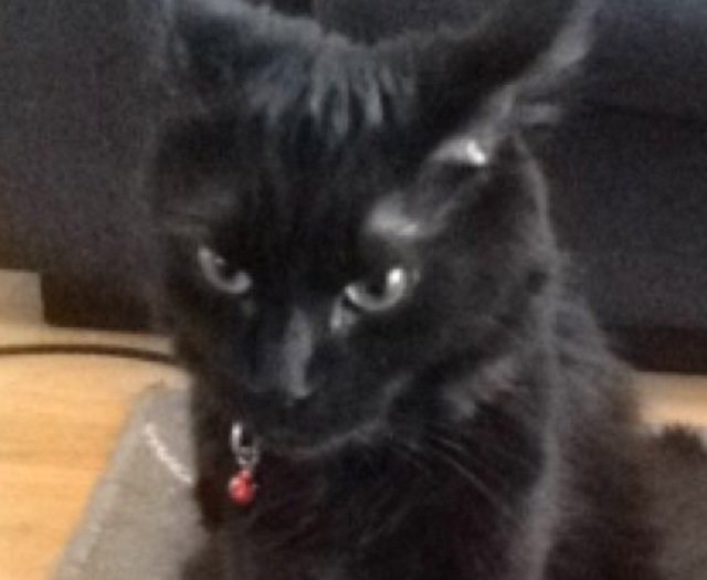 Helt svart, langhåret, litt tynn jentepus med runde klare grønne/gule øyner. Hun har mistet litt pels på høyre side bryst.