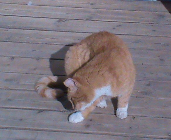 Rødoransje med hvit snipp i ansiktet, hvitt bryst og 3 hvite poter. Ganske sjenert for fremmede, men også veldig tillitsfull og kosete hvis hun først har godkjent deg.