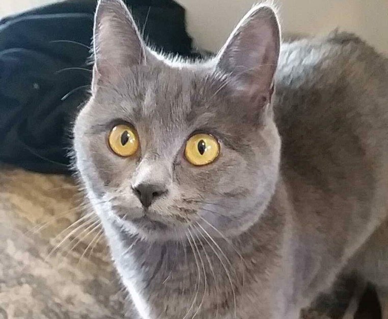 Hun er grå, med svarte svake ringe rundt halen. Gule øyner.