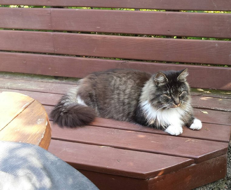 Katten er langhåret med svart,brun og grå fargevariasjoner. Hvit under haken og magen. Veldig kjælen. Katten er ikke chippet.
