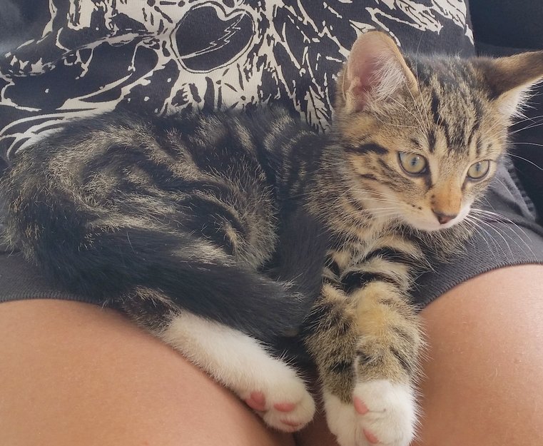 Kattungen fulgte etter min mor da hun var ute å luftet sin hund på Kariåsen i Sandefjord. Hun visste ikke hva hun skulle gjøre med den. Og tok den med hjem til oss. Kattungen er nå i pensjon hus en dyrekjær venninne.