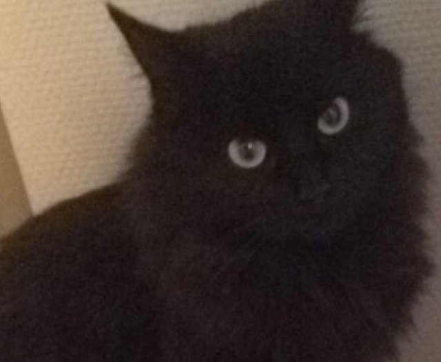 Helt svart langhåret litt tynn jentepus. Hun har mistet litt pels på høyre side bryst.